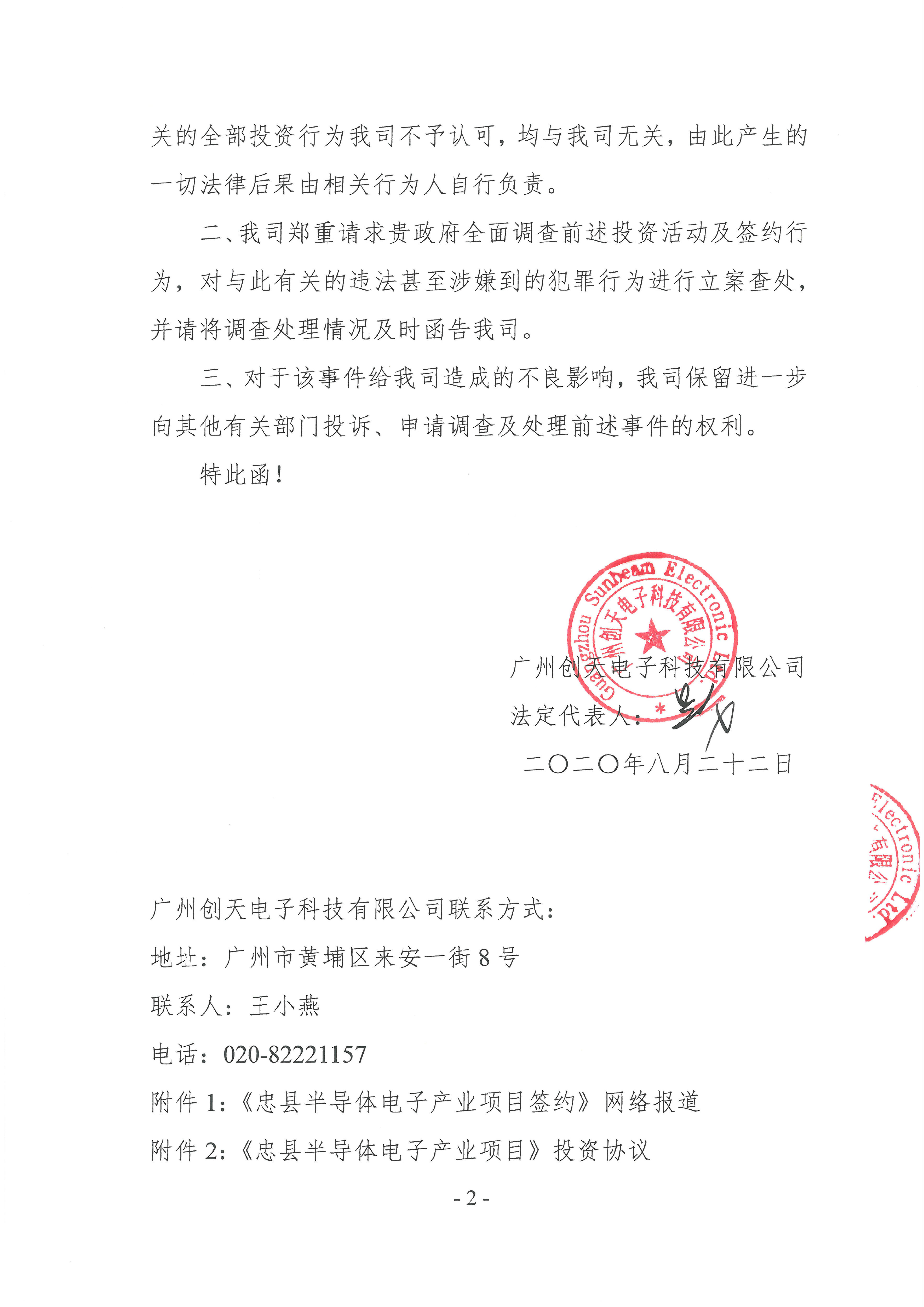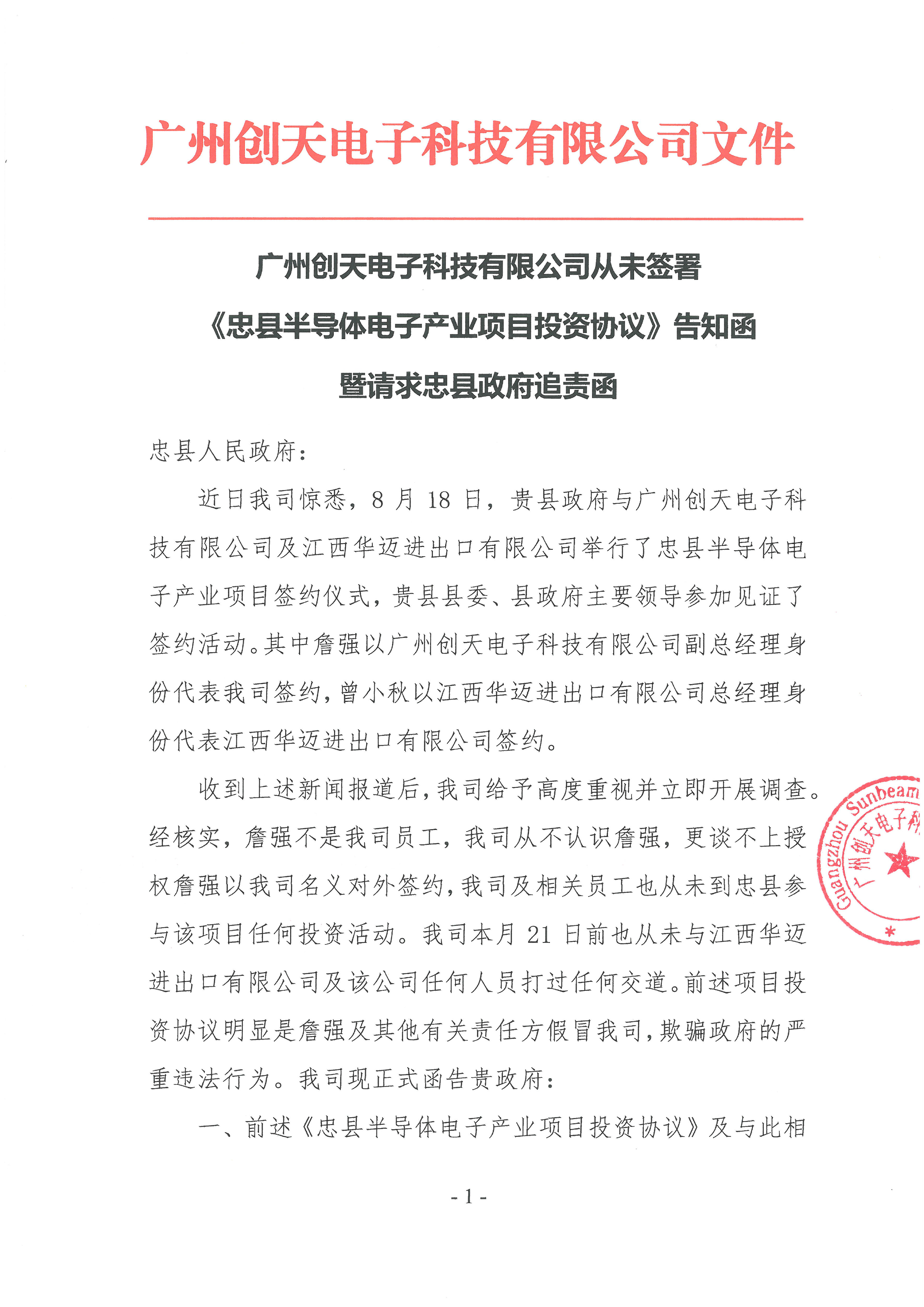 廣州創天電子科技有限公司從未簽署 《忠縣半導體電子產業項目投資協議》聲明